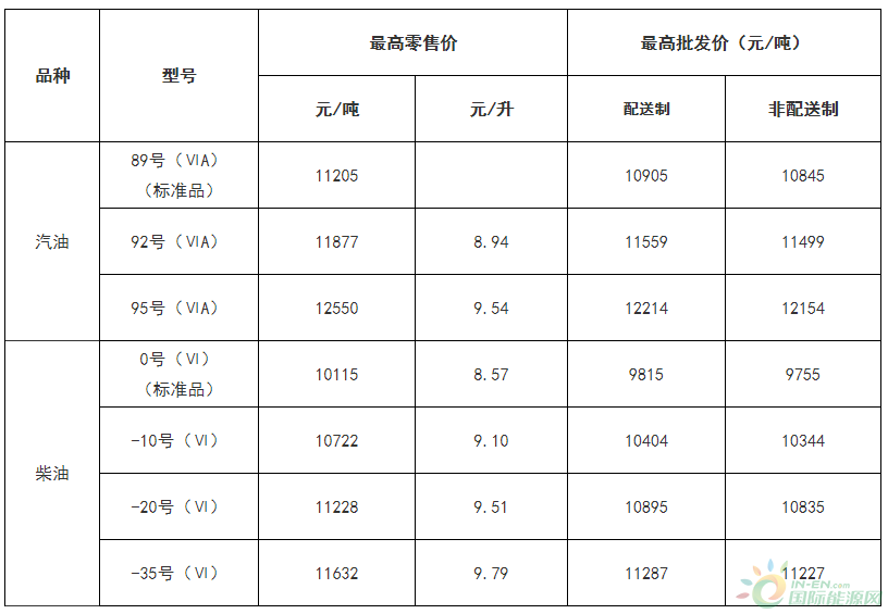 2、表中汽油和柴油价格为符合第六阶段强制性国家标准VIA车用汽油和VI车用柴油价格。
