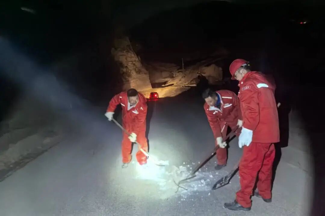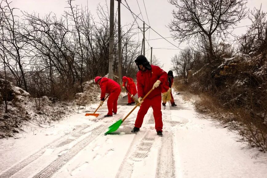 他们有的顶着严寒撒盐融雪